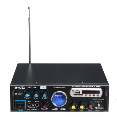 Descripiton:1. Two main channel output.2. Supports FM stereo radio.3. With Remote control function.4. Built-in LCD display, with backlight function.5.DC/ AC power in, Suitable foe home or your car.6. Mini HIFI digital bluetooth audio power amplifier.7. With treble, bass, & volume control, very easy to use.8. Two microphone input slot, karaoke system in your home or in car.9. Low distortion supplies a clearer, stronger & more powerful sound.10.SD Card, U disk, MP3 format play, support bluetooth wireless connection. Feature: Model BT-266 Color Black Input Voltage AC 220V/ DC12V (in car) Plug EU Plugbluetooth Support Output Power 80W +80 W Peak Power 240W+ 240 W Channel 2CHLoad Impedance 4-8SNR-89 db FM Frequency 87.5-108 M Hz Distoration Rate 0.05% Frequency 10 Hz-20 K Hz Sensitivity 0.25m V-220m VRC Power Supply CR2052 Battery (built-in) Size Approx. 25.5x 23.5x 8cm Package Included:1 X Audio Amplifier 1 X Remote Control 1 X Manual